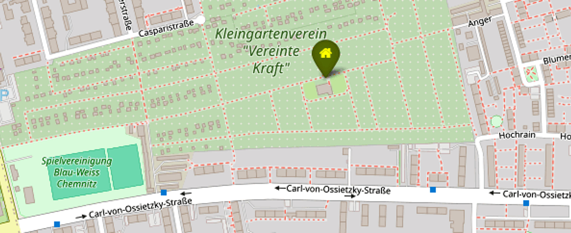 Unser Kleingartenverein liegt im Herzen der Stadt Chemnitz. Fast 400 Gärten befinden sich hier im Stadtteil Chemnitz-Gablenz zwischen der Carl-von-Ossietzky-Straße und Casparistraße.